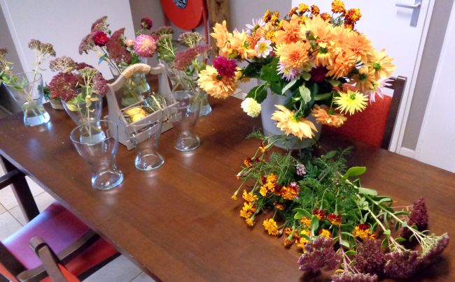 Het herfstachtige natte weer zorgt voor steeds minder bloemen uit eigentuin voor op de tafels van de zorgboerderij en voor heel veel bladeren, die nu massaal van de bomen vallen, zowel op onze zorgboerderij als op ons zorgerf in Ypelo. Het toch nog groeizame weer nodigt uit de gazons te maaien en de herfstbladeren op te ruimen.